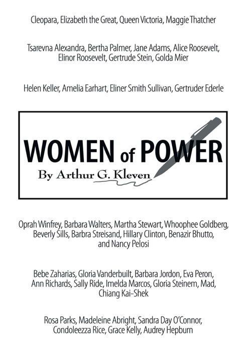 WOMEN OF POWER Great women have done great things, Since the beginning of history, women have used their power to shape the events in a changing world. Some have been influential in great social advances and some have contributed to great disasters. Each of these women has an interesting story of their love, ambition and their goals. These stories are about Cleopatra, Queen Victoria, Maggie Thatcher, Elinor Rooseelt, Golda Mier, Helen Keller, Barbara Jordon, Eva Peron, Oprah Winfry, Imelda Marcos, Rosa Parks, Condoleezza Rice, Ginger Rogers, Nancy Poloske, & Hillary Clinton, and many more.